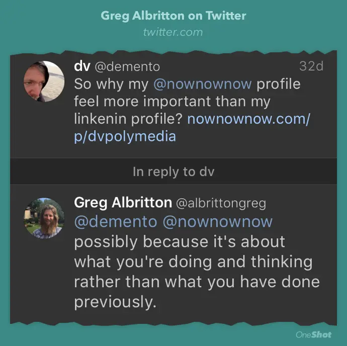 Why @nownownow feels important than LinkedIn? @albrittongreg nails it in reply to @demento https://t.co/SBV7f5y9kl https://t.co/giwpbQbZtt