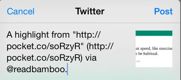 @readbamboo @chengyinliu : share text on Twitter has to be the title of the article or the selected text.