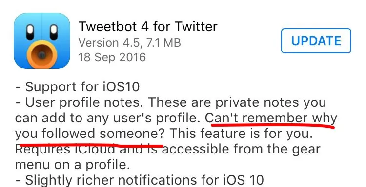 Awesome feature from @tweetbot. Now I can mark why I followed someone. Going to be very useful. https://t.co/fjV0qS9LbS