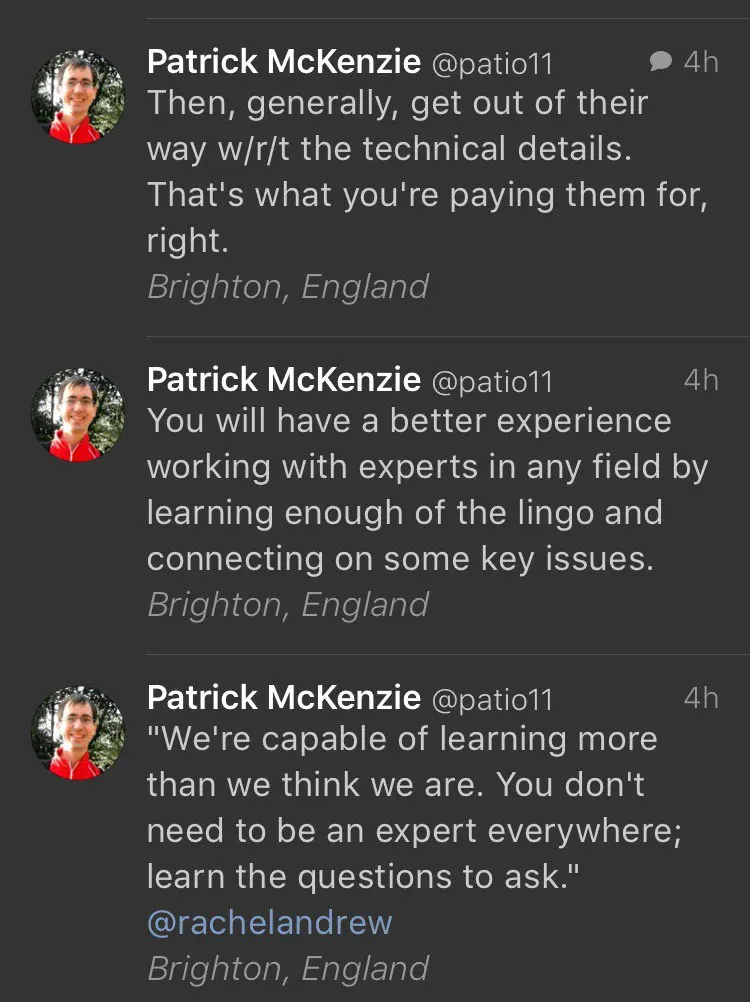 This advice of @patio11 holds good for non-tech owners running tech companies.