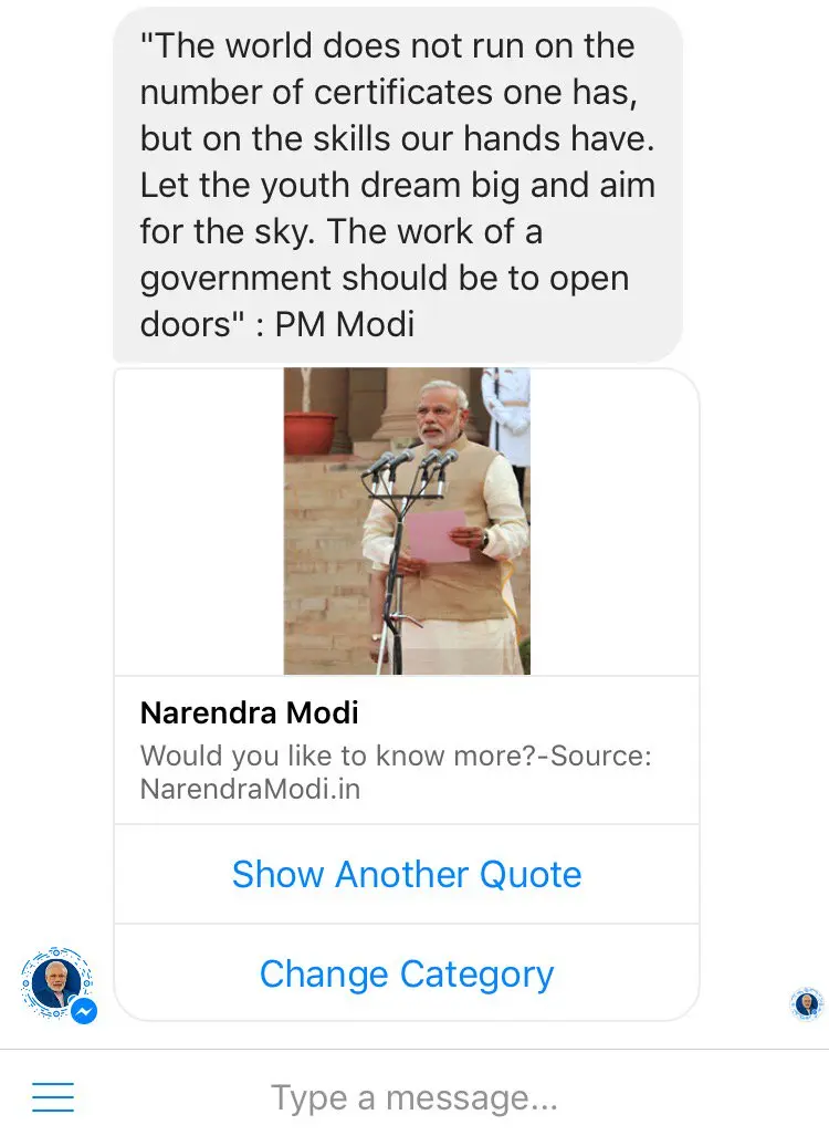@kiranshaw we created a FB bot abt our PM Modi: https://t.co/jIX1U6azmJ. Would love your feedback.