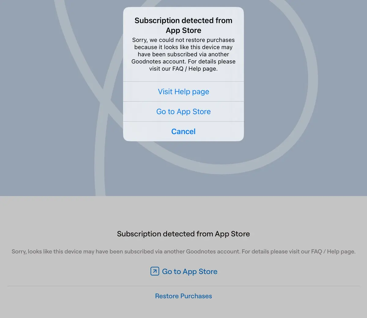Hey @GoodnotesApp I already have subscription for v6 but app (both on iphone & mac) gives this message. I login via my apple id on both. And the appstore page shows the current subscription until next year https://t.co/bb1xtBqihf