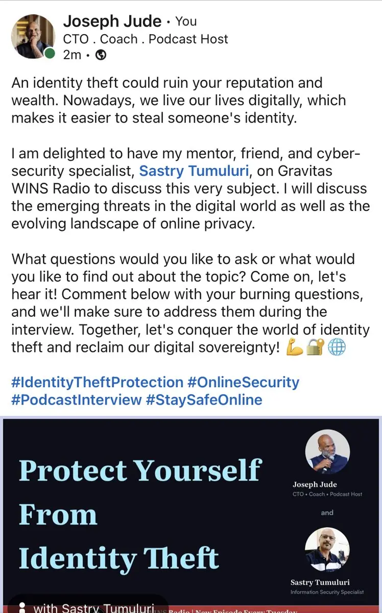 An identity theft could ruin your reputation and wealth. Nowadays, we live our lives digitally, which makes it easier to steal someone's identity. I'm going to interview @sastrytumuluri about this topic for my podcast. What questions should I ask him? https://t.co/NMqZyqAzCn