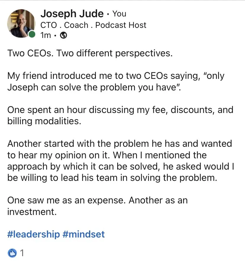 Met someone I coached 3 years back. He walked up to me in a conference and introduced himself. Now he has setup two IT companies. EU & UN are his clients. Said my mentoring was part of his success. Feels good to hear that. Now I know how teachers feel.