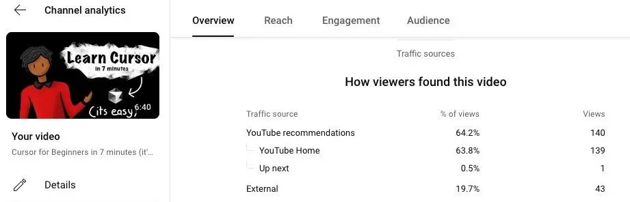 My son published an introductory video about @cursor_ai It is now recommended by youtube algorithm. 64% of the traffic is via YT recommendation. You can watch it here: https://t.co/8R1iVsdEVq https://t.co/CzVOh5wFYs