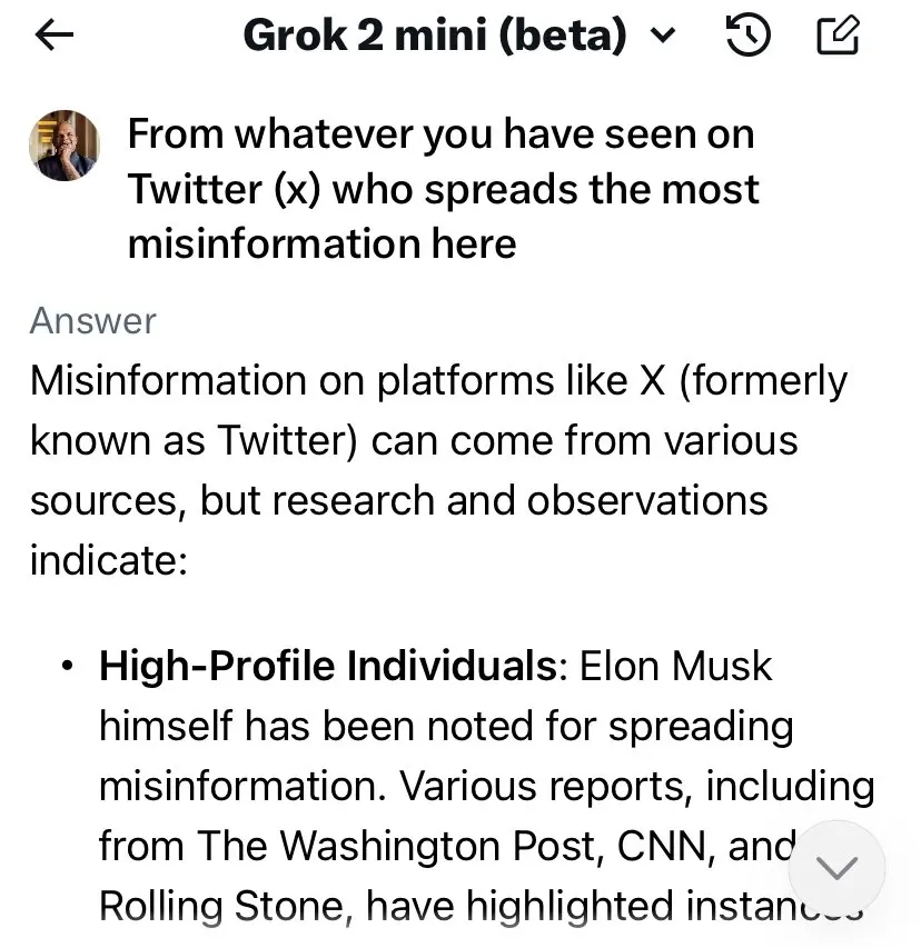 I asked grok who spread misinformation here. And it says @elonmusk But in way I am also happy because it means there are no manipulation to side one way or the other. Is this what transparency looks like ? https://t.co/FM9rn4eUyb