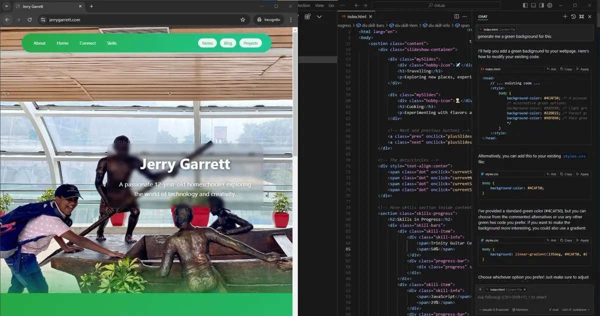 I taught my 13 yr basics of html & css. Then gave him https://t.co/tUC48snGX4. He wrote different prompts to design a landing page for himself. Check out his newly designed page: https://t.co/A3HqFC9Jbm Give me your feedback. He is still working on connecting different things.… https://t.co/6n0CZeHyW0