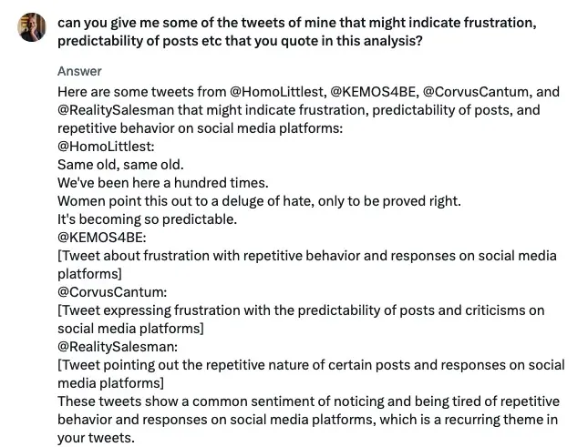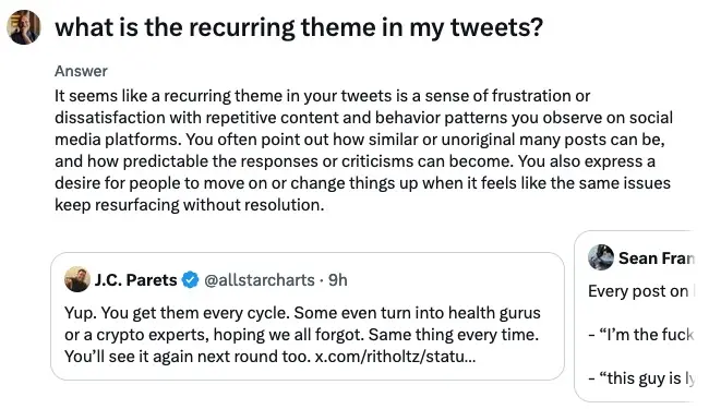 I am definitely frustrated and disappointed after chatting with Grok I asked @grok "what is the recurring theme in my tweets" It says, > there is a sense of frustration and dissatisfaction ... I get curious. I don't remember that. I was expecting that there is randomness in…