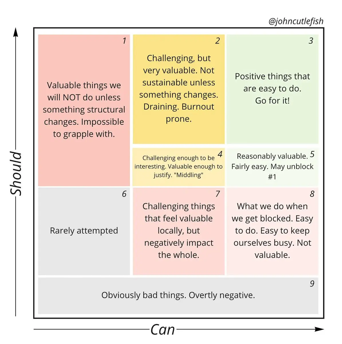Can Do vs. Should Do by @johncutlefish 1️⃣represents the valuable things that we can't work on right now. 2️⃣is valuable AND possible, but only with a lot of unsustainable sacrifice. Leads to burnout. 3️⃣work is valuable, possible, and within a comfortable "can" range. 4️⃣ might be…