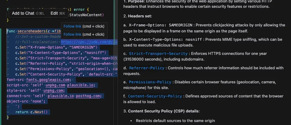 No excuse for not understanding blocks of code. I selected a block of code where I set secure headers and asked @cursor_ai to explain it. It gave me clear explanation of what the code does and why it is so. I usually validate AI tools with what I already know. If the tool is…