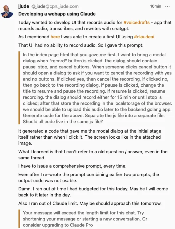 I'm trying to develop a webapp by chatting with @AnthropicAI Yesterday I had a fantastic experience. Today not so much. I ran out of time as well as Claude limit. Will try tomorrow. #buildinpublic