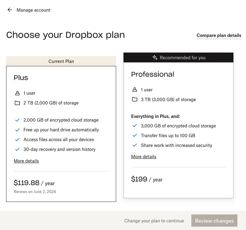 Hey @dropbox / @DropboxSupport I don't want to change the plan. I just want to renew. But I can't proceed. Isn't this a dark pattern? Forcing user to upgrade to a plan that they don't want?