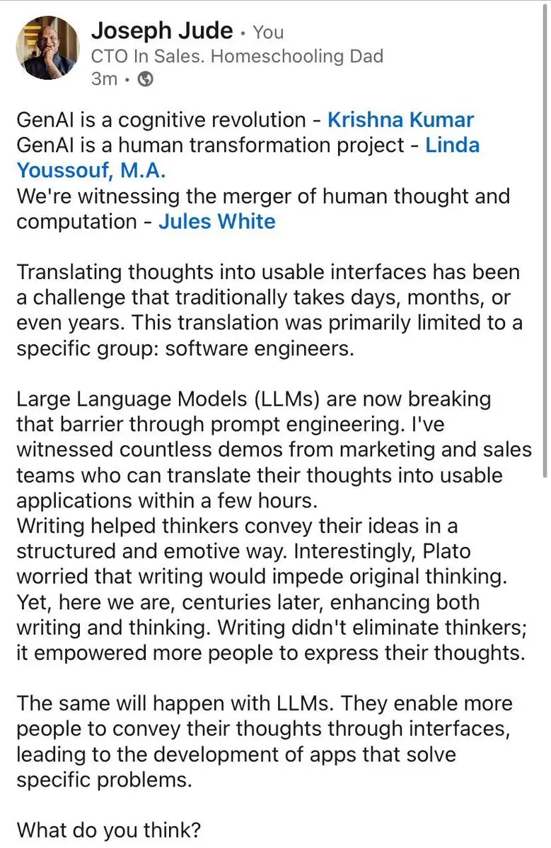 People who say GenAI will replace jobs are those who don’t use GenAI tools daily. They read a hyper content creator on Twitter or a consultant report and parrot rather than from first hand experience. If they use they will know it fails often and cant expose that to customers.