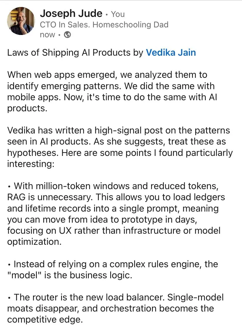 A high signal post by @vedikaja_in: https://t.co/p182fwINgw High signal ⇒ dense ⇒ requires unpacking As @bhavishsood said: A refreshing post amidst Agentic AI noise. https://t.co/id6ftHuPNX