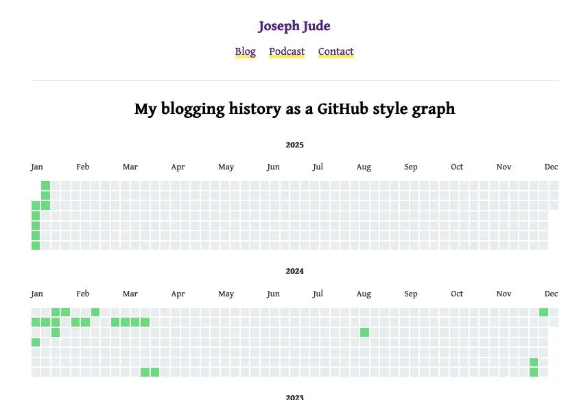 My posting history as a Github style graph: Been posting since 2005. 20 years of blogging here
