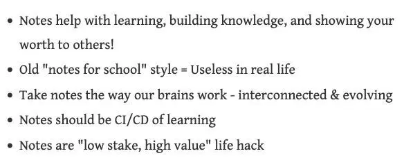 Take notes the way our brains work If you are new to #pkm and wondering the benefits of taking notes, read my summary of video by Nicole, a Dev Advocate at Grafana Labs (but not a dev!).