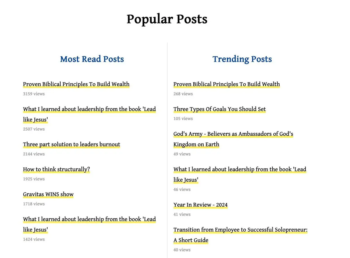 Trending posts this week: • Employee to Solopreneur: • Review of 2024: • Three Types Of Goals You Should Set: • Writing my obituary: