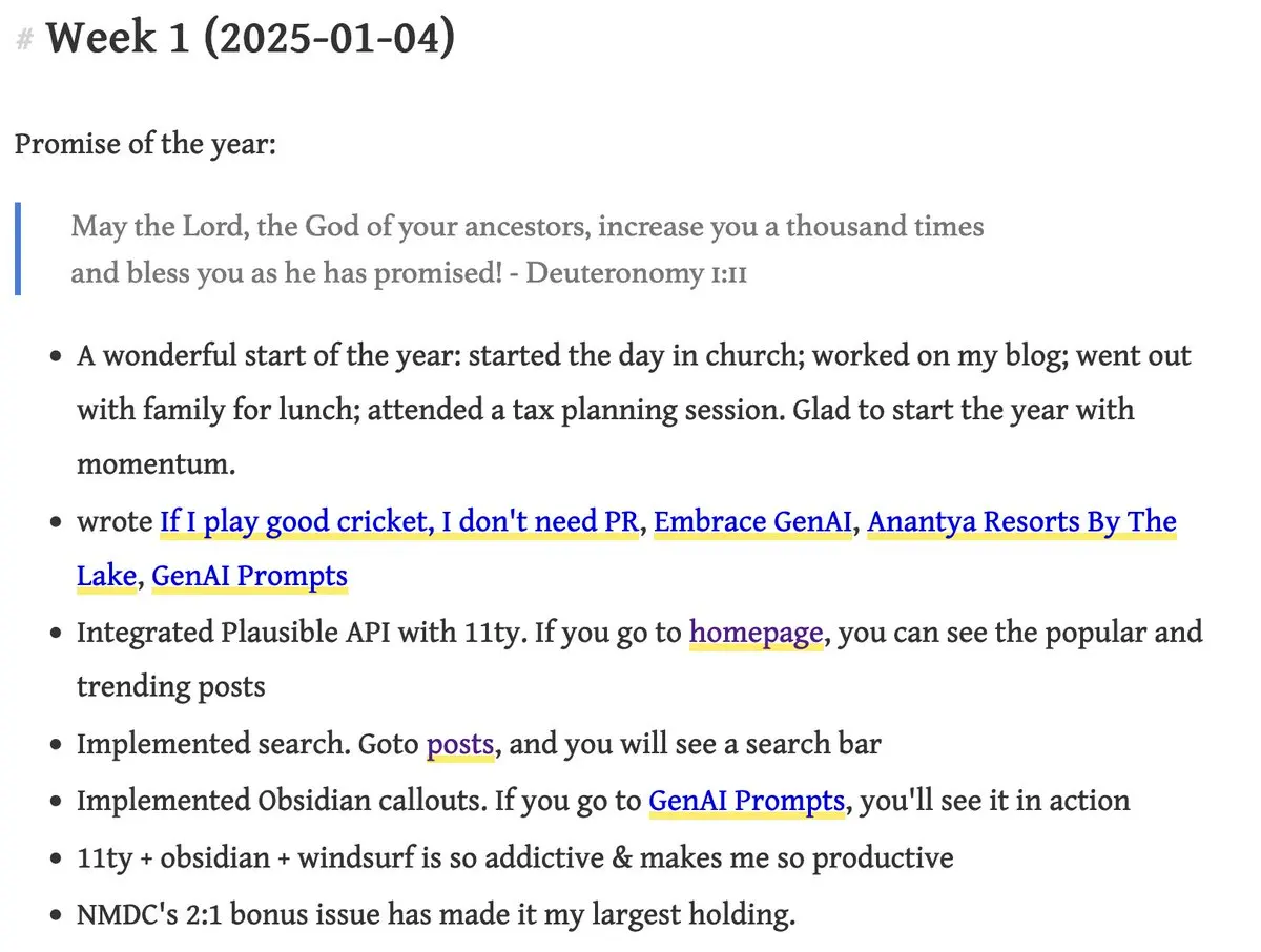 2025 Week Notes So glad to start the year with momentum. Able to do so much in just 4 days. Obsidian + 11ty + Windsurf is an super duper combination for blogging. Read full notes here: