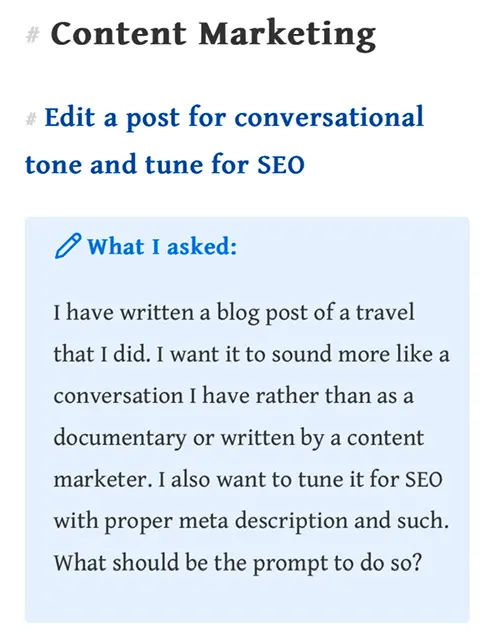 I am using GenAI tools (chatgpt, windsurf, WhatsApp AI) for everything I do: • rewrite blog posts in conversational tone • fine tune blog posts for SEO • questions on Biblical passages I am publishing all those prompts here: