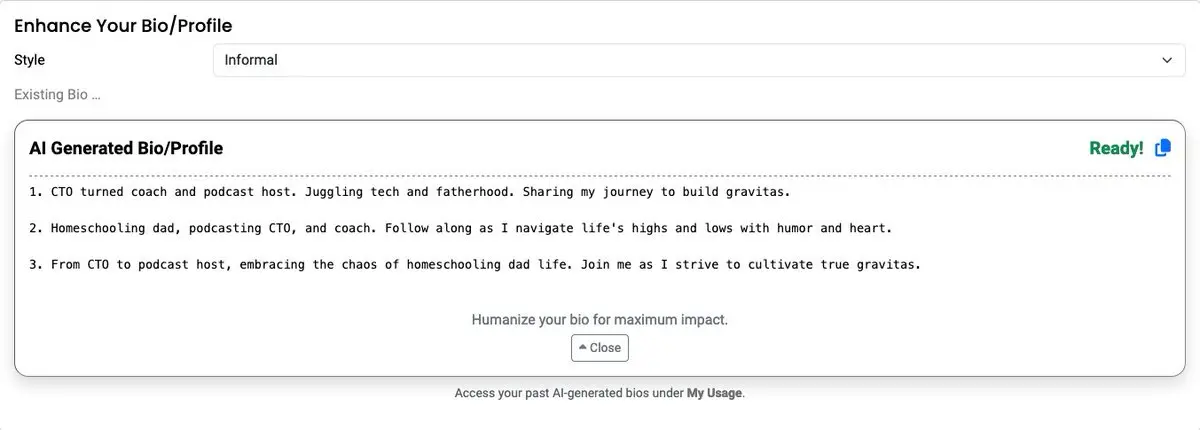 @_zenman Good to read that. Though I'm not in the target market, I was surprised to see how well the output was for the twitter bio generator. Good work Manish (would love to talk to you about this)