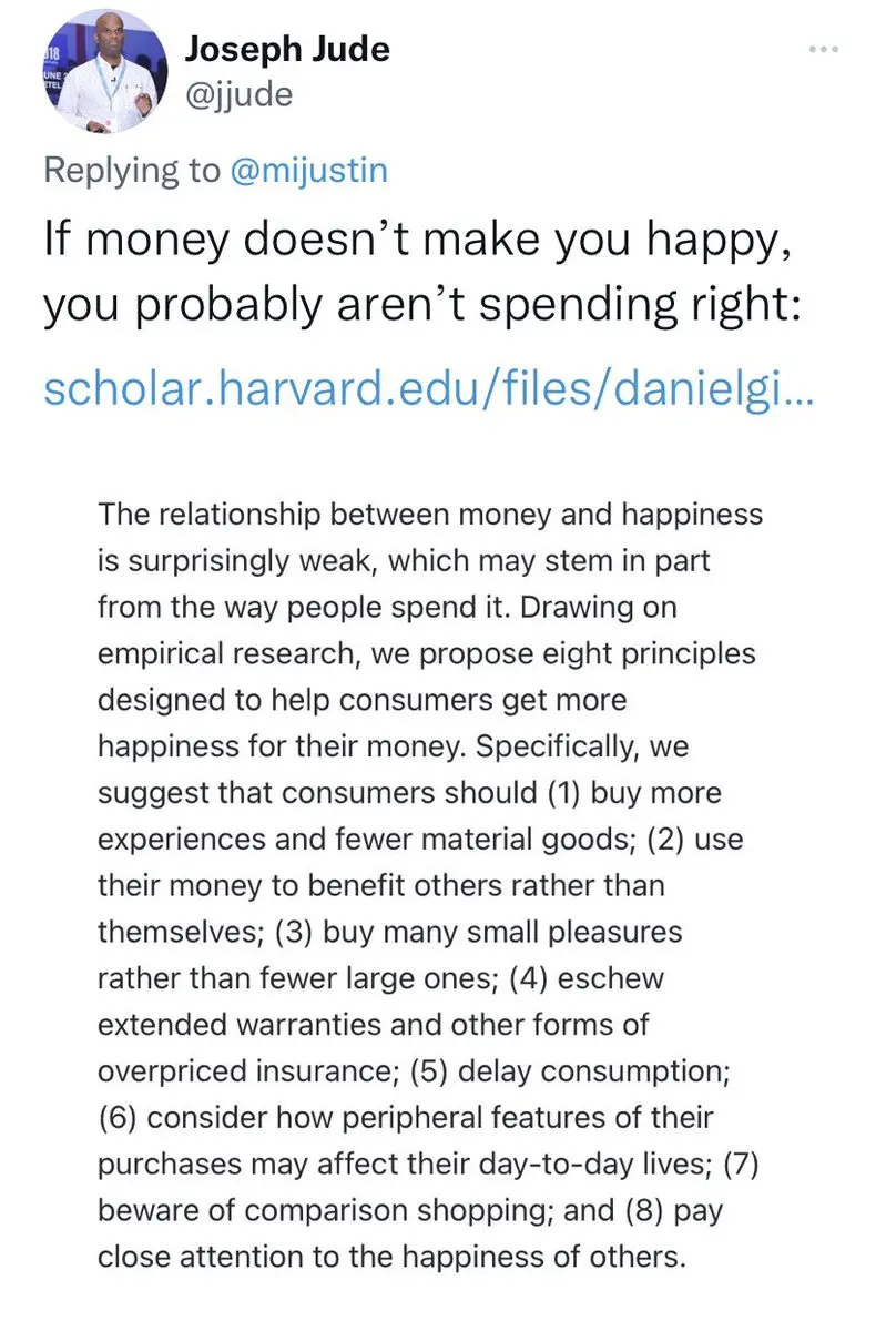 @mijustin If money doesn’t make you happy, you probably aren’t spending right: