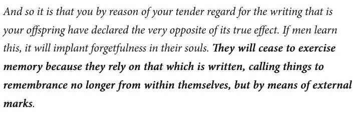 1. Technology advances Almost all technological advances invited strong counter reactions. Plato said this about writing: > they will cease to exercise memory because they rely on that which is written