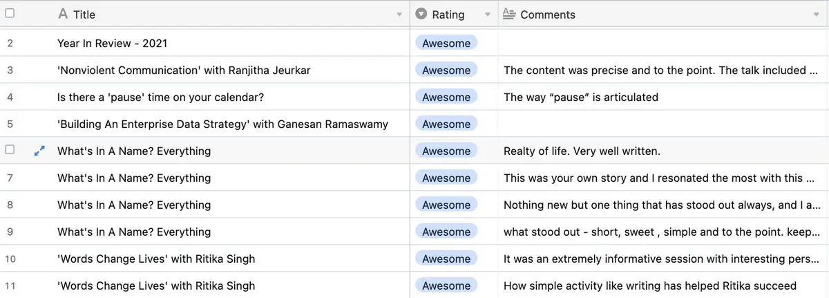 @itswhoissane @Rahul_J_Mathur I use @airtable to collect feedback from my site readers. If you go to any of the post on my site (ex: ), there is a "How you feel about this article" section. When you click one of the options, it takes the reader to an Airtable form Comments look as 👇