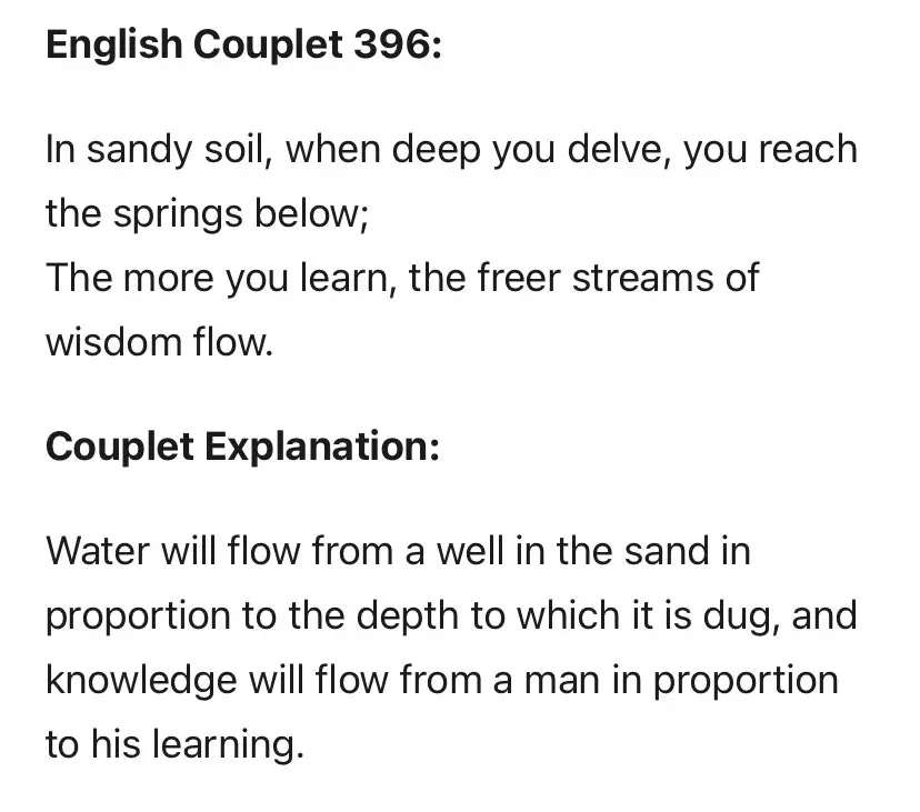 @William3Willis In Tamil, my mother tongue we hv an ancient book called Kural. It is full of wise sayings in couplet form. One says this: More you dig a well, the more water you get Likewise more you learn, the more wise you’ll be