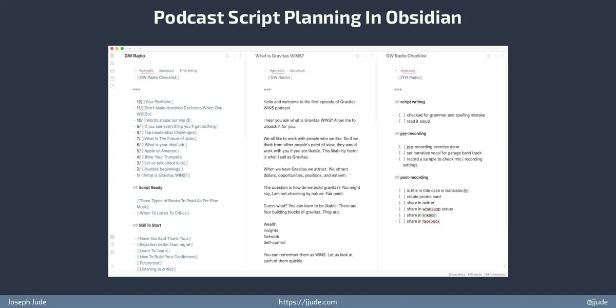 All planning happens in @obsdmd . • topics to create • episode script • podcast checklist All are stored in Obsidian. It is my digital brain. Everything goes there. If I've to edit on mobile, I use @1writerapp
