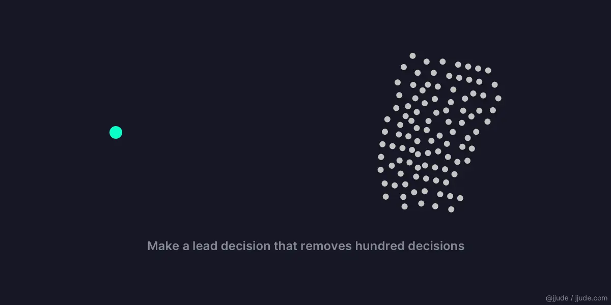 Here are some examples of how I follow such "lead" decisions that remove other decisions. Dieting: I used to calculate calories for every food item. Not any more. I fast for 16 hours. Other times I eat what I eat regularly, avoiding aerated drinks & fast-food